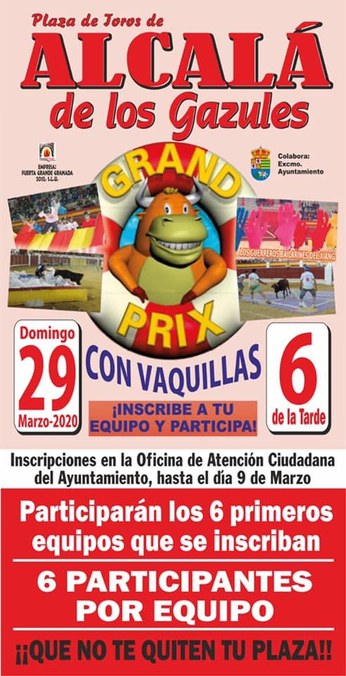 El próximo 29 de Marzo,a a partir de las 18:00 horas, se celebrará en Alcalá de los Gazules el GRAND PRiX con vaquillas en la plaza habilitada en el Recinto Ferial. 6 grupos formados por 6 personas. Inscríbete en la Oficina de Atención al Ciudadano del Ayuntamiento de Alcalá de los Gazules hasta el 9 de Marzo.